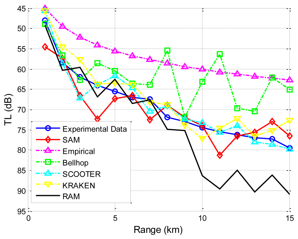 The accuracy of a new model can be verified by comparisons with results using previously validated models and with experimental data. In our work, results from standard methods (Ray Model, Normal Mode, Wavenumber Integration, and Parabolic Equation (PE)) are used. They are chosen for comparison because they are the most popular and accurate underwater acoustics models [12,14]. Since there are many implementations for each method, four well-known models (details can be found in Reference [37]), namely, Bellhop for ray theory, KRAKEN for normal mode, SCOOTER for wavenumber integration, and RAM for PE, are incorporated in this paper. Besides, one widely used approximation method for predicting transmission loss in UANs, having an expression of 15lgd + d × 10−2lgα(f) (d is the Euclidean distance between the source and the destination), denoted Empirical, is also included. Two sets of experimental data are used to evaluate the performance of SAM.