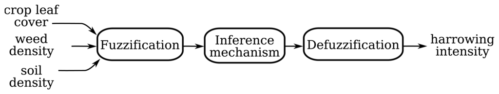 A linguistic fuzzy logic decision making based method was developed to control the adjustment of the harrowing intensity according to three input variables: crop leaf cover, weed density and soil density. The harrowing intensities from the experiments in 2007–2009, which achieved high selectivity, high crop yield gains or negligible crop yield reductions (Table 2), were assigned as the optimal output intensities, as described below. The mathematical principle to construct this decision making based method was a fuzzy rule-based inference system (Figure 2). This system has three main components: fuzzification interface (fuzzy sets), inference mechanism based on if-then rules, and defuzzification interface [20]. A broader description of fuzzy logic has been outlined by several authors [17,21–23].