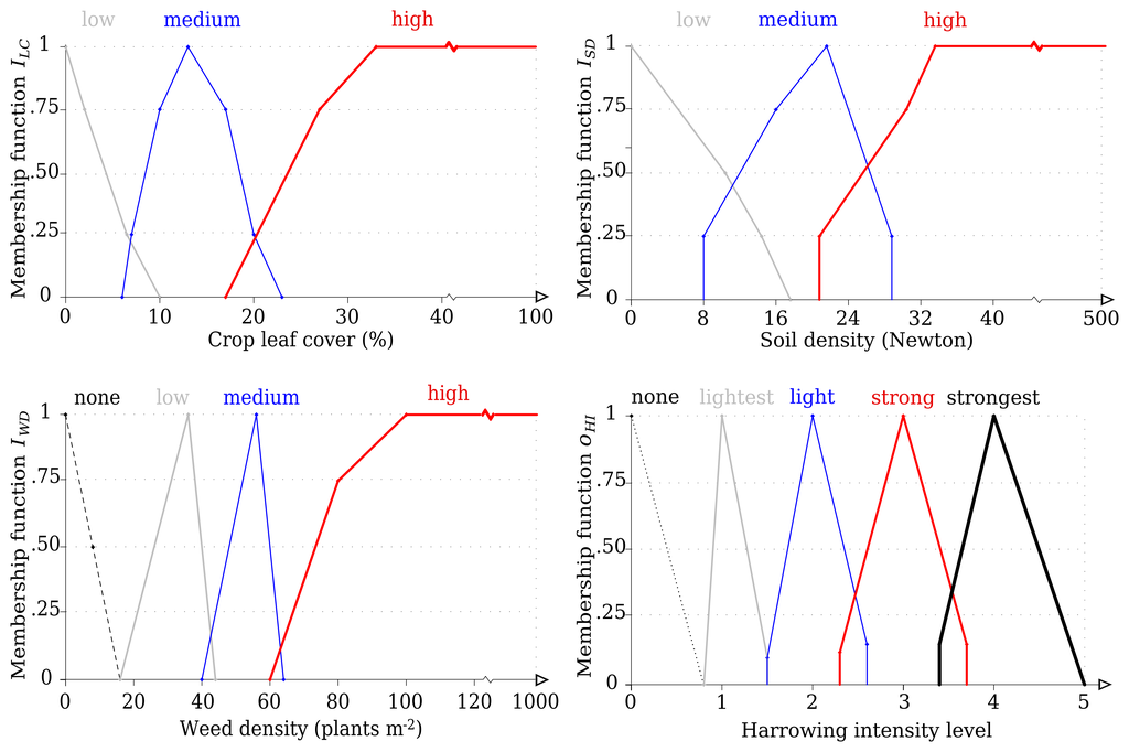 The fuzzification interface received the assessed numeric inputs: crop leaf cover, weed density and soil density. These values were translated into “fuzzy sets” characterizing the linguistic variables crop leaf cover (ILC), weed density (IWD), soil density (ISD). The optimal harrowing intensities defined (none, lightest, light, strong, strongest) and tested in previous experiments were also fuzzified into the fuzzy set harrowing intensity (OHI). All fuzzy sets were characterized through membership functions (MF) with a continuum degree of membership. Three MF were determined for ILC and ISD, and four for IWD (Figure 3). The universes of discourse for the fuzzy sets were determined as explained below. Crop leaf cover measured at BBCH 12–14 depicted the “low” MF of ILC; older growth stages, such as BBCH 15–21 and BBCH 22–31, characterized the medium and high levels, respectively. At a crop leaf cover lower than 2%, the crop would not resist being harrowed, but with more than 40% leaf cover, the crop could withstand an aggressive harrowing intensity. A high weed competition was assumed with 100 weeds m−2 or more, at which harrowing must be applied with maximum intensity level. No weed competition was assigned at a density below 15 weeds m−2. For ISD, higher membership degrees than 30 N indicated a highly dense soil, in which weed harrowing would not be favorable due to poor soil workability [19].