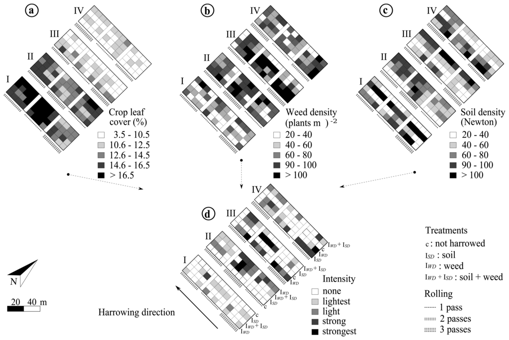 In general, for both experiments, weed density was effectively reduced by harrowing. In experiment A, varying the intensity according to the measured variability of soil and weeds increased the weed reduction (P = 0.09). F-test in the mixed model and Tukey (HSD) ranking showed that weed density was reduced in comparison with the untreated plots in experiments A (P < 0.001) and B (P < 0.0001), Table 4. In experiment A, contrasts between the varied intensity throughout the whole plot against the individual fixed intensities suggested that a higher weed density reduction might be achieved (P = 0.009) when the intensity is not kept constant along the cultivated plot. Similarly, Søgaard [5] found that changing the tine angle of the harrow along the whole plot reduced the variations in working depth, thus soil cover and weed control would be uniform. In experiment B, although varying the harrowing intensity effectively reduced weed density compared with the untreated control (P < 0.001), there was no difference in the way of varying the intensity, i.e., according to either soil- or weed occurrence or a combination of both assessments (P = 0.42). Soil density was not influenced by the 1 to 3 passes with the roller, thus the desired high, medium and low levels of compaction could not be achieved. Therefore, soil density assessed before harrowing was almost constant across the whole experimental area (Figure 4(c)).