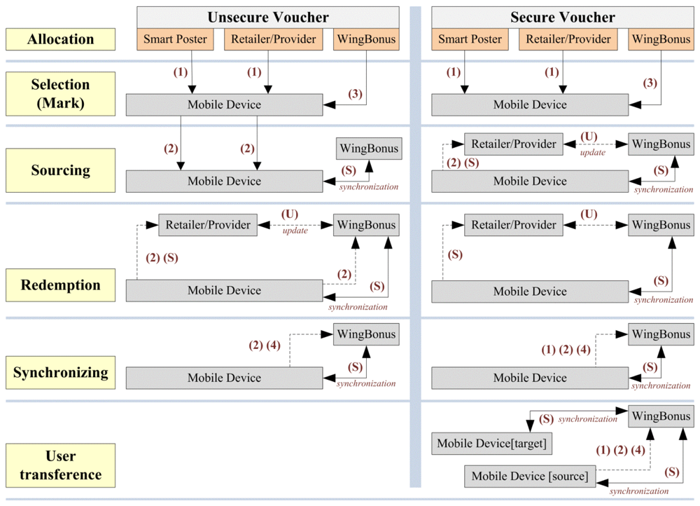 Figure 3 shows the different kind of flows depending on the voucher security and the actors participating in the different phases of the voucher lifecycle. Thus, flows (1) and (2) represent the information gathered by the mobile application from smart posters and retailers (or providers), respectively; (3) represents the information managed by WingBonus server that it can be marked and sourced to users, and (4) the information sent to the WingBonus server by the mobile application in order to be validated and later to process a synchronization between server and mobile applications; finally the flow of synchronization (S) is in charge of matching information between both sides, mobile and server, maintaining the consistency of the information, and the flow label as (U) represents the communication between retailers (and providers) with the server application in order to share information about any information transference between users and retailers (and providers) and users with WingBonus server.