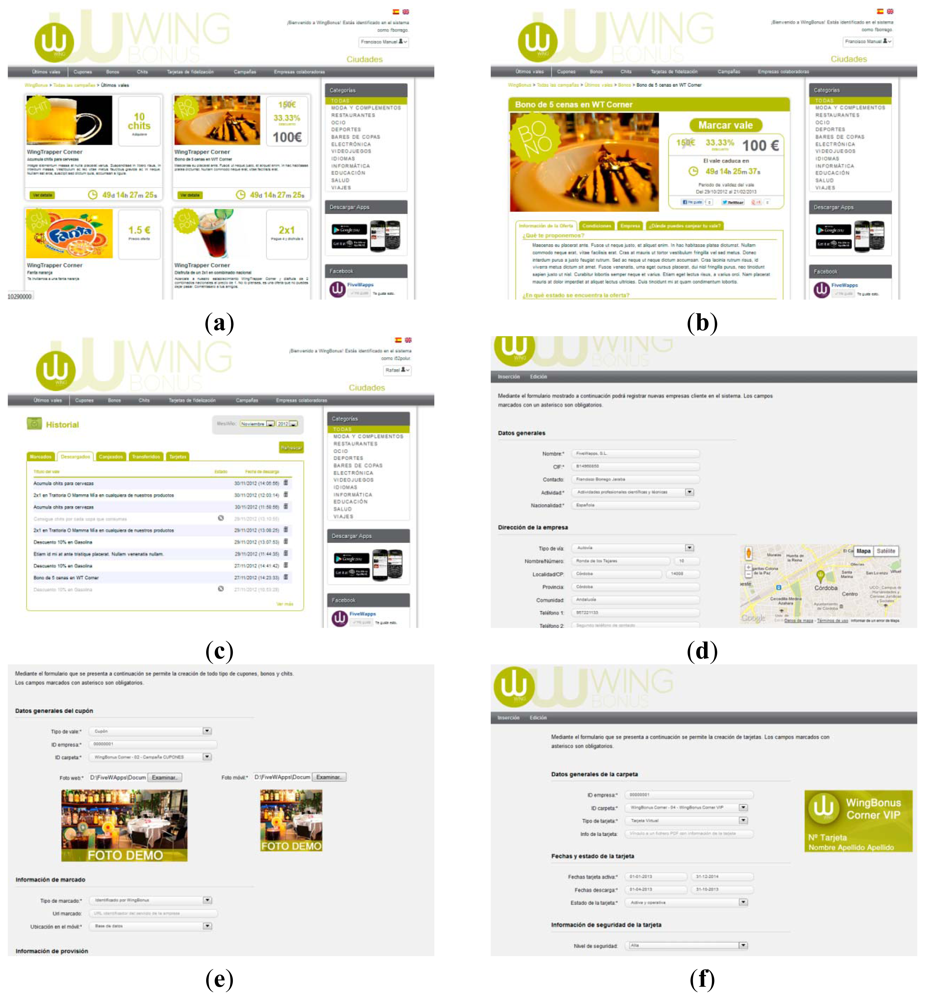 Moreover, the WingBonus server provides a complete administration tool for the management of the information. Thus, Figure 4(d) shows the screenshot corresponding to the management of user data for retailers/providers. Figure 4(e) corresponds to the management of an advertising campaign for vouchers and Figure 4(f) to the management of loyalty cards. In addition, this administration tool involves a set of functionalities in charge of the data analysis and of generating different reports oriented to collecting information on users, vouchers, user preferences and activity, marketing, companies and so on.