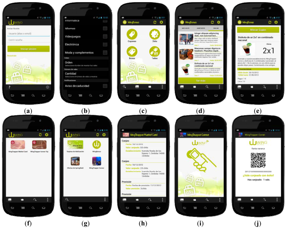 WingBonus mobile allows storing an unlimited number of electronic vouchers. As Figure 5(g) shows, vouchers are organized in containers, identifying the different provider campaigns or companies. In addition, containers could be organized in folders. Folders indentify the different business activities and different campaigns using different images and they may be assigned different requirements or characteristics depending on company politics.