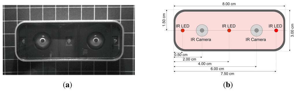 The Leap Motion controller is a new consumer-grade sensor developed by Leap Motion (Leap Motion, http://www.leapmotion.com). It is primarily designed for hand gesture and finger position detection in interactive software applications. Because of current patent pending, only insufficient information on the underlying software's geometrical or mathematical frameworks is available. Nevertheless, first impressions of position detection capabilities are promising (Section 5). Thus, the presented analysis does not focus on the controller's technical details. A detailed analysis of the sensor's accuracy and repeatability will be presented. Figure 1 shows a schematic view of the controller's hardware setup. Besides three infrared emitters the device incorporates two CCD cameras (cf. Figure 1(a)). As stated by the manufacturer, the sensor's accuracy in fingertip position detection is approximately 0.01 mm.