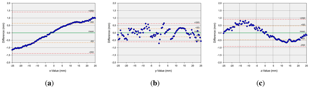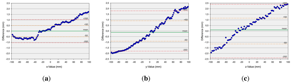 The second measurement setup, in the case of dynamic pen tip positioning, refers to the measurement of discrete points on a robot path. First axis-aligned movements are evaluated. Linear paths of 200 mm along the xy-, xz- and yz-planes, centered on the center point of the Leap Motion controller, are generated and drawn by the robot. Figure 9 shows the evaluation of these measurements with Bland-Altman diagrams [25]. The graph represents the mean difference (green line) of the position of the robot and the measured value by the Leap Motion controller (once the robot has arrived at its target position) and limits of agreement as the mean difference (mean)—orange (±sd) and red (±2sd) dotted lines. As can be observed, the absolute values of the mean deviations are in all cases less than 0.1 mm, while the x-deviation is approximately 0 mm. The standard deviation is approximately 0.5 mm in the case of the x-values, above 1.0 mm in the case of the y-values and below 1.0 mm in the case of the z-values. The x- and y-values show a statistically significant correlation with a correlation coefficient (Pearson) of 0.875. The x- and z-values have even more significant correlation with a correlation coefficient of 0.979, and the y- and z-values show significant correlation with a correlation coefficient of 0.955. It can be seen that the deviation in the sensor's position detection accuracy is a monotonic function of the distance to the origin of the Leap Motion controller's coordinate system. It can be stated that the Leap Motion controller is more accurate on the x-dimension. On the y- and z-dimension, less accurate results are obtained. It seems that this is caused by the horizontal alignment of the IR cameras. Subsequently, a path along a sinus function in the xy-plane is drawn with a support of 50 mm again centered on the controller's center point. This relatively small support is chosen in order to minimize the detected distortions based on the distance of the desired point to the controller's center point. As can be seen in Figure 10, the mean deviation is in all cases approximately 0 mm. The standard deviation sd is below 0.7 mm in the case of the x-values, below 0.5 mm in the case of the y-values and below 0.3 mm in the case of the z-values. Overall, the evaluation of the dynamic scenarios shows the high potential of the Leap Motion controller in gesture detection systems, where accurate path determination is of superior importance.