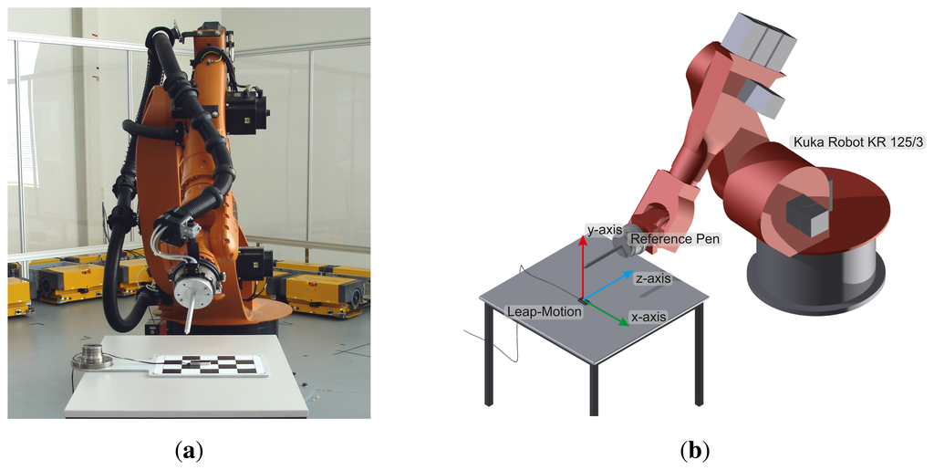 A modified robot cell is utilized as the measurement setup consisting of a Leap Motion controller, an industrial robot (Kuka (KUKA Roboter GmbH, http://www.kuka-robotics.com) KR 125/3) and a reference pen as visualized in Figure 2. The Leap Motion controller is fixed on a plane in the range of the robot TCP (Tool Control Point) and the reference pen is attached to the robot tool [19]. By establishing a fixed known relationship of the pen tip and the TCP and defining the pen as a new robot tool, an indirect reference through the robot kinematics to the world coordinate system of the robot is created [20]. Hence, two static coordinate systems are linked through the pen tip point, the world coordinate system of the robot and of the Leap sensor.
