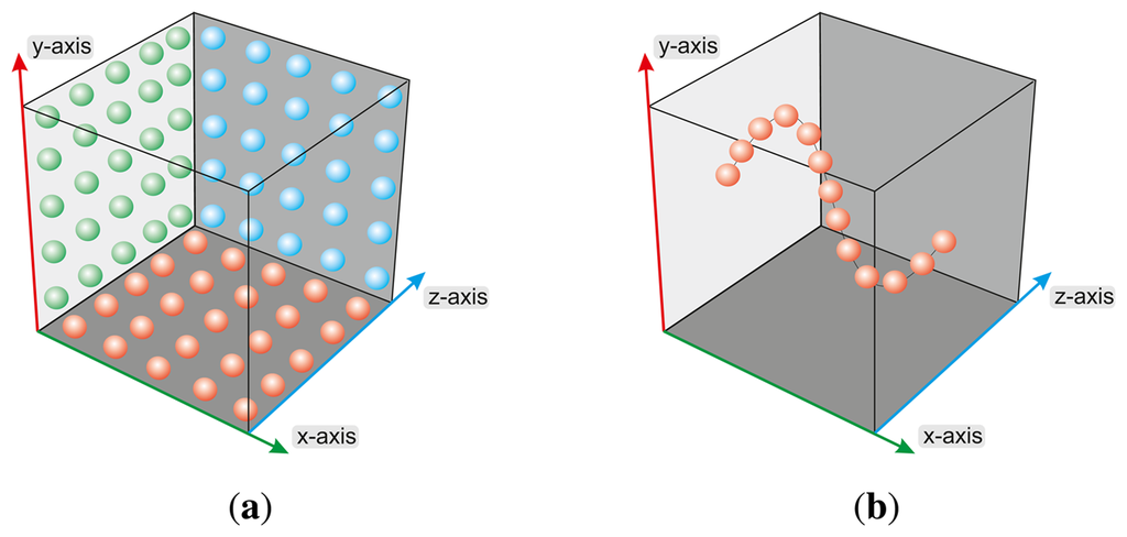 The operating principle of the measurement of optical 3D sensors can be, in principle, divided into the following mechanisms: Structured Light, Time of Flight and Stereo-Vision. Structured light sensors analyze the deformation (warping) of a known pattern onto an unknown surface to determine the three-dimensional shape [6]—representative examples include Microsoft's Kinect sensor (Kinect For Windows, http://www.microsoft.com/en-us/kinectforwindows) and Asus Xtion Live (Asus Xtion Pro Live, http://www.asus.de/Multimedia/Motion_Sensor/Xtion_PRO). For a generalized overview of comparisons between the mechanisms, see, e.g. [7]. The Time of Flight (TOF) 3D cameras are based on the well-known time of flight principle [8]. Additionally, there is a differentiation between PMD (Photonic Mixer Device) and laser sensors. A PMD sensor (e.g., Swissranger 4000 (Mesa Imaging, http://www.mesa-imaging.ch), PMDVision CamCube 3.0 (PMDVision, http://www.pmdtec.com)) measures the distance to an object by emitting modulated infrared light and determining the phase shift between the emitted and reflected light. In case of a laser sensor (e.g., Laser Sick LMS511 (Laser Sick LMS511, http://www.sick.com/group/en/home/products/product_news/industrial instrumentation/pages/bulkscan_laser_volume_flowmeter.aspx)) the distance to an object is measured by emitting pulsed laser beams and determining the time the reflected light needs to travel back to the sensor. Stereo Vision cameras (e.g., the Bumblebee 2 sensor (Point Grey Research, http://www.ptgrey.com/products/bumblebee2)) consist of two optical 2D cameras with known extrinsic parameters. The concept of determining the depth in the scene is based on searching correspondence points in both 2D images [9]. Optical tracking systems (e.g., [10]) use the raw data (n-dimensional point clouds) of optical 3D sensors in order to detect the position of predefined markers in the Cartesian space of the viewed scene.