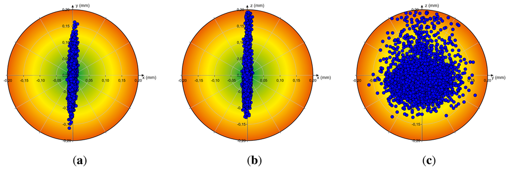 The results of the analysis of accuracy Acc and repeatability Rep (cf. Section 3.3) of the Leap Motion controller by measuring the reference pen tip position in a static scenario, thus when the robot stays in a desired static position (in each case R = 5, 000 measurements), are illustrated in Figure 4. The particular diagrams visualize the deviation between the desired static Cartesian position and the measured positions relative to the xy-plane (a), xz-plane (b) and yz-plane (c). Independent from the axis, the deviation between the desired position and the measured positions is less than 0.20 mm. In the case of the x-axis the deviation is less than 0.17 mm.