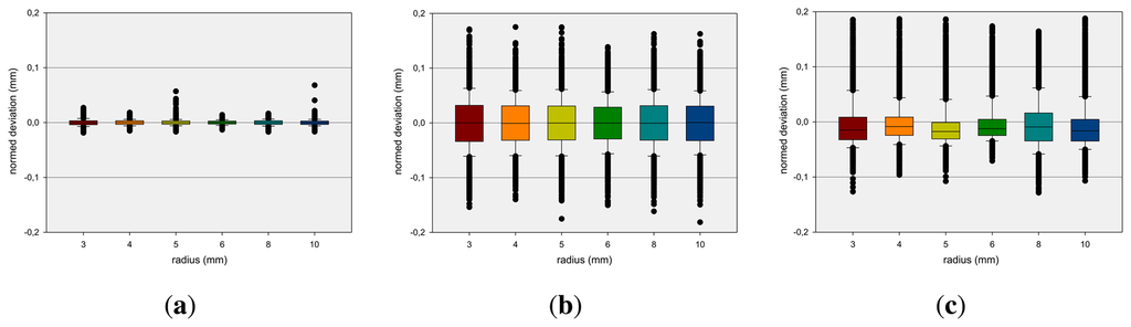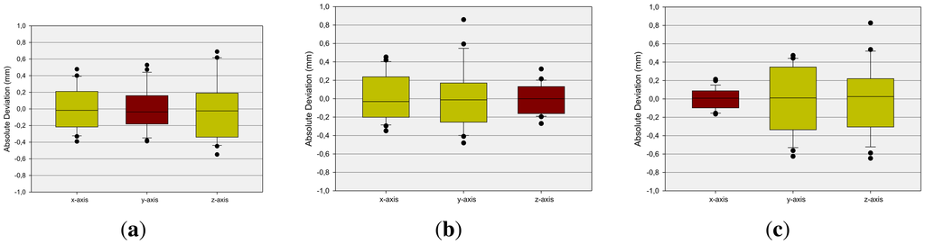 A relevant question is if the dimension of the reference pen influences the measurement results. This is analyzed by measuring static positions of pen tips with different diameters. The box-and-whisker plots [24] in Figure 5 show the average deviation concerning the x-, y- and z-axis at different diameters (see Section 4) of the reference pen. The boxes are representing the interquartile range that contains 50% of the values and the whiskers are marking the minimum and maximum values, excluding outliers (marked as black points). The mean x-deviation is approximately 0 mm while mean y- and z-deviations show higher variances. It can be observed that the measurements are independent from the radius of the reference pen.