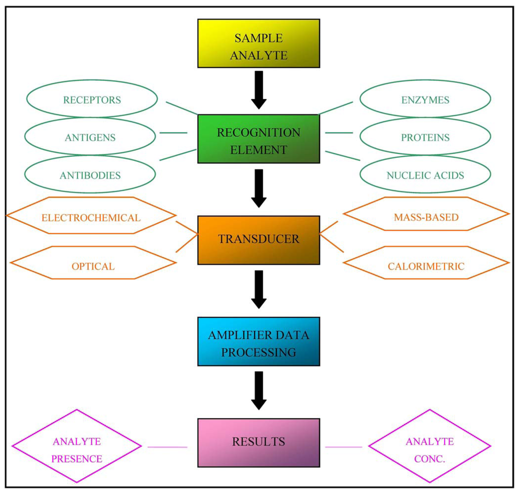 Biosensors can be classified into four classes on the basis of the type of transducer: optical (colorimetric, fluorescent, luminescent, and interferometric) biosensors, mass-based (piezoelectric and acoustic wave) biosensors, calorimetric, and electrochemical (amperometric, potentiometric and conductometric) biosensors [4]. Alternatively, they can be classified on the basis of the nature of recognition [5].