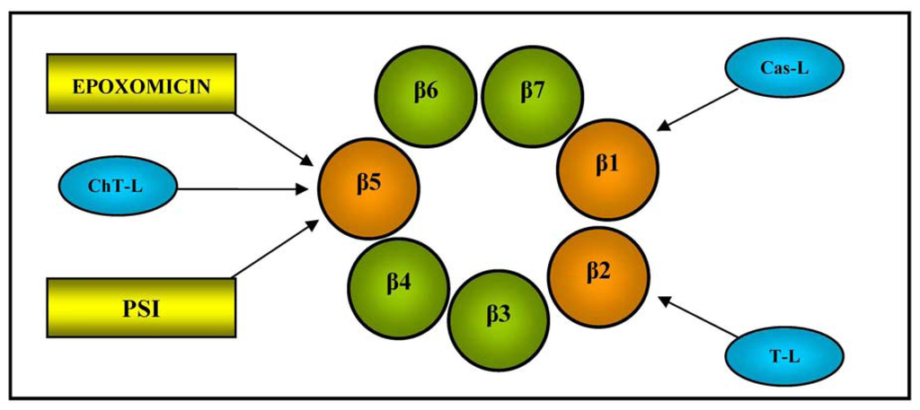 It has a mass weight of 700 kDa and a cylindrical structure consisting of two outer α-rings and two inner β-rings, each with seven different subunits (α1-7 and β1-7). The function of the outer α subunits is to control the entry of substrate proteins into the central catalytic zone and bind the regulators, whereas the three inner β1, β2, and β5 subunits contain a catalytically active N-terminal threonine (Thr) residue, and are respectively responsible for caspase-like (Cas-L), trypsin-like (T-L) and chymotrypsin-like (ChT-L) activities (see Figure 2 for a schematic illustration of 20S proteasome β-ring); the last is the rate-limiting step in the degradation of intracellular proteins [47].
