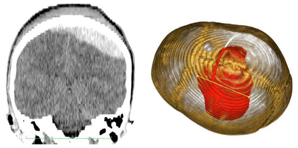 Correlations with bony structures and skin structures can be made by changing the attenuation of the exam. As this is dynamic process, you can see the hematomas on transparent bone and correlate with macroscopic skin key points like the ear or the superior temporal line. The only major problem is that it is not possible to make curved-linear measurement with OsiriX. In order to decreased error we have perfomed several associative measures for the same patient (correlating with skin and bony structures) (Supplementary Material, VIDEO 1).