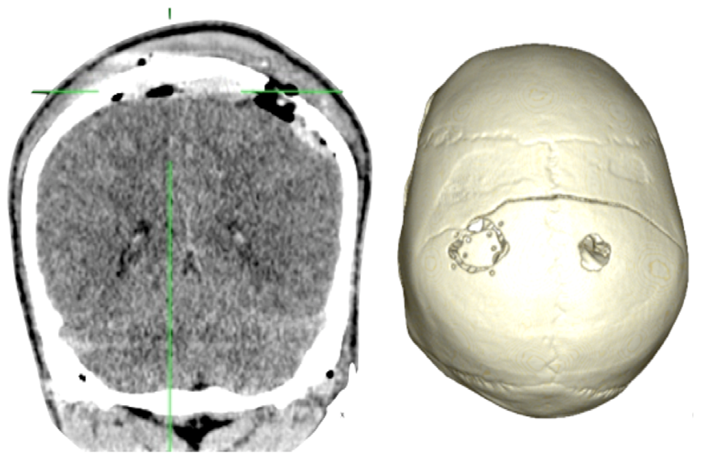 The 3D reconstruction enabled a minimally invasive approach to this case. A linear incision was made at the site where the center of the hematoma is located, and a 2.5-cm diameter craniotomy was created. Another 1.5 cm incision and 1 cm burr-hole was performed in the contralateral side, leaving the hematoma beneath the superior sagittal sinus untouched. After surgery the patient had an excellent recovery with no neurological deficits. He was discharged three days after admission to the hospital.