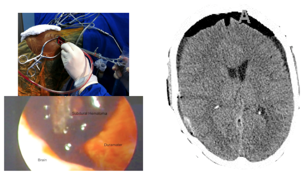 A 61-year-old alcoholic man was a patient who was hit by a motorcycle. Initially, he was alert and fully oriented. In the emergency department, the patient became disoriented; the examination revealed no signs of injury, and coagulation studies were normal. Within 30 min after the initial evaluation, his neurologic status deteriorated (GCS of 8). The CT scan revealed an acute right-sided post-traumatic intracranial parietal contusion containing an intraparenchymal hematoma, and acute subarachnoid hemorrhage in the right sylvian fissure. The patient underwent intubation and referred promptly to the operating room. Through the interpretation of the images 3D, we identify the best entry point for an endoscopic approach through a burr-hole. The patient had adequate recovery and was discharged seven days after surgery.