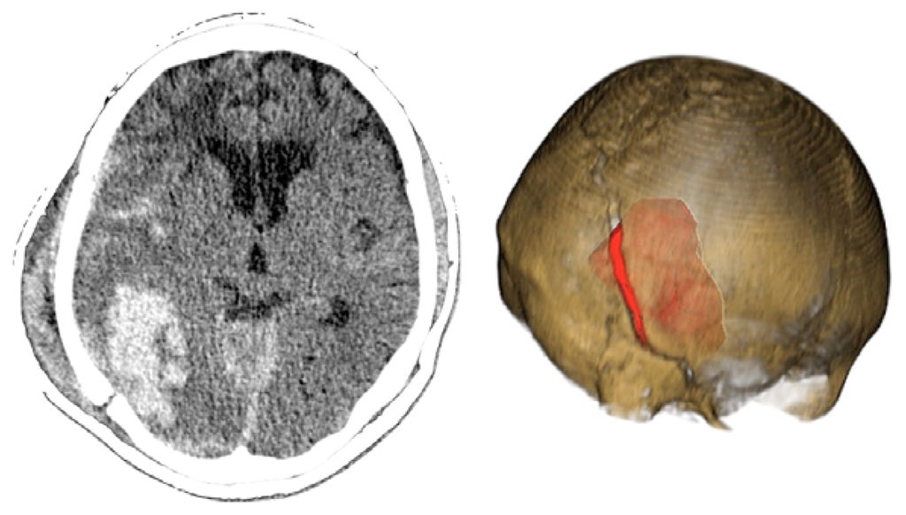 The results provide evidence that 3-D visualization of the cranial surface is superior to 2-D for brain trauma surgery. The proposed method for 3-D brain surface visualization does not require in-depth computational knowledge and has acceptable preparation time [40]. The 3-D visualization was accurate and fast. The resulting 3-D images were shown to be useful for intra-operative orientation to the exact position of the craniotomy independent from patient urgency.