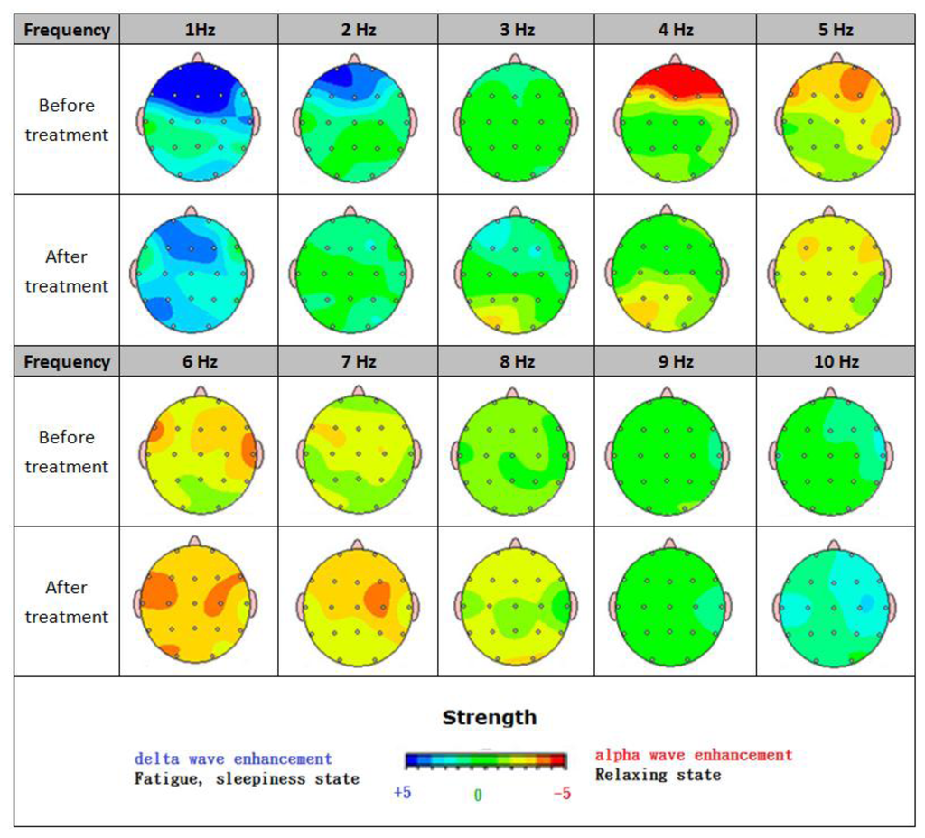 The following items are important initial conditions for the BEAM map experiment: (1) The experimental participating members: an eleven-year-old developmentally delayed boy. (2) Treatment time: about three months. (3) Frequency bands: 1 Hz∼10 Hz. six spectrum analysis of the time-domain waveform frequency segment.