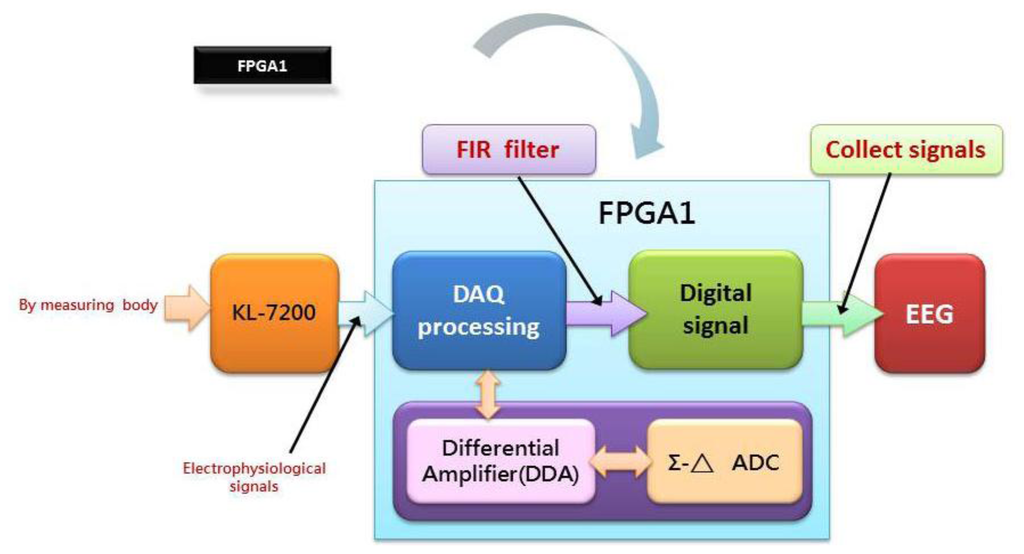 As demonstrated in Figure 2, an EEG signal is converted into digital form and then reconstructed, say by use of an FIR filter. The way a signal is collected is seen important when multiple feature extractions from an EEG signal are made by a PXA 270 processor [62,64,73–76].
