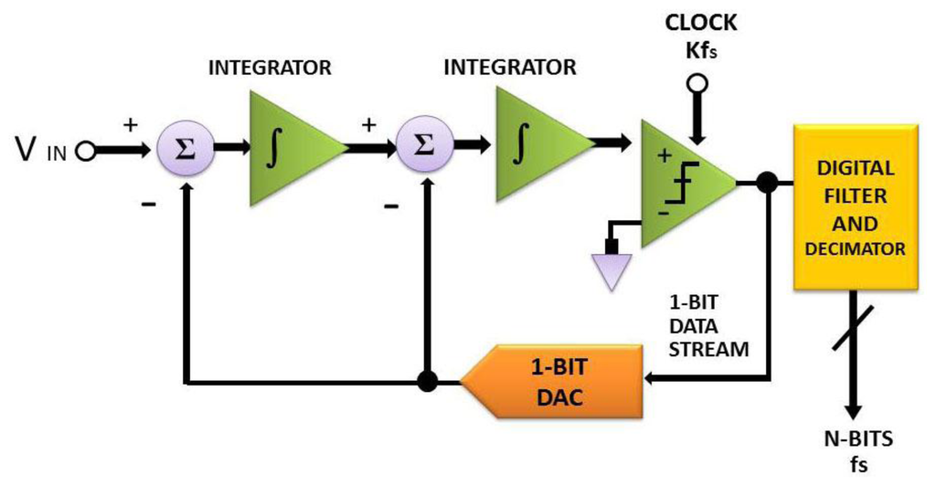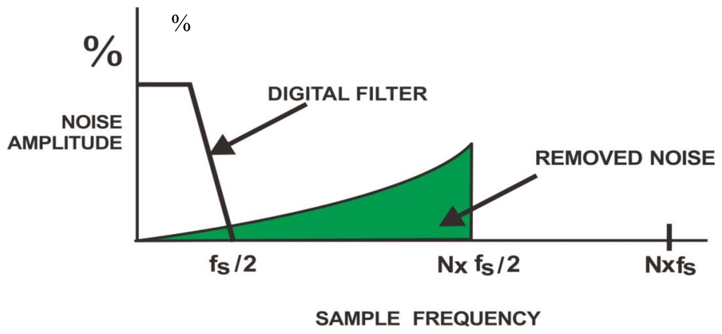 As can be found from Equation (1), the output y is approximated as the input x at low frequencies, while y is as the quantization noise Q, as presented in Figure 6. As the consequence of oversampling, the spectrum of Q is redistributed to the region beyond that of the signal of interest. Hence, as presented in [68], most of the noise can be removed by use of a single low pass filter.