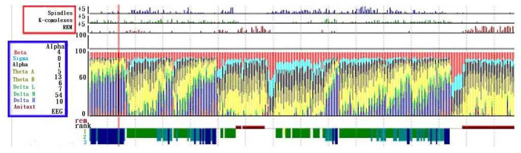 Vertex sharp waves: It is a negative sharp wave embedded in a slow time varying signal, arising in the second half of an NREM stage 1. K-complex: It is a combination of a sharp wave and a subsequent slow varying positive wave, emerging in stage 1 of NREM sleep. Spindle wave: As a feature of stage 2 of NREM sleep, it is a 12–14 cps transient wave with non-stationary amplitude. Saw tooth wave: As a feature of REM sleep, it is a wave with lower amplitude. Demonstrated in Figure 9 are the analysis results, provided by the Gerontechnolgoy Research Center, Yuan Ze University, Taoyuan, Taiwan, based on brain waves measured with P-Series PS2. Within the blue frame, the types of brain waves are indicated and the percentages thereof at any time instant are recorded as well, while within the red frame, brain wave feature extractions are made, i.e., spindle, K-complex waves and REM, for the identification of stages 1, 2, NREM sleep and REM sleep. On the right hand side is a long term record of the percentage of each type of brain wave alone with the feature thereof [72].