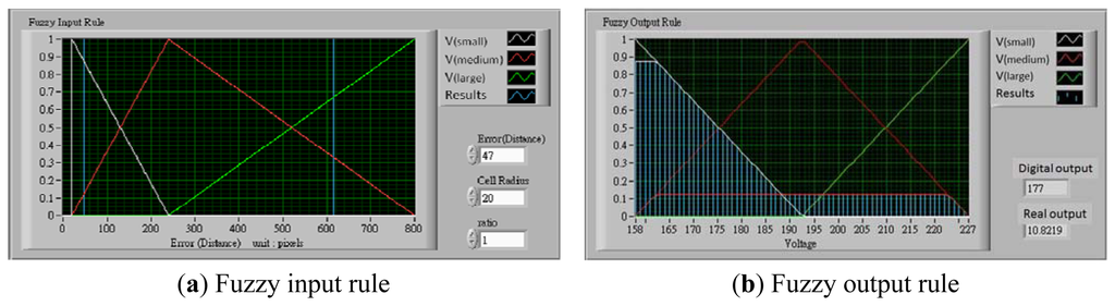 The voltage controller is developed based on the center of gravity defuzzification. Given that the size of the acquisition image frame is 640 × 480 pixels in length and width, its diagonal length is 800 pixels. The largest movement distance is 800 pixels when the tracked cell and target location are located at the end point of the diagonal, and the smallest movement distance is the radius of the tracked cell. The movement distance changes with cell size and the radius ratio setting. The fuzzy membership functions are: