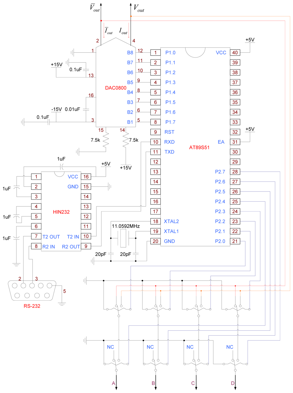 As shown in Figure 11, the control circuit is based on an AT89S51 single chip and uses RS-232 as interface for communication with a computer to receive two control data. First, four relays are used to control A, B, C and D electrodes for changing the electric field direction. In addition, an 8 bit DAC0800 IC is used to convert digital signals into an analog output voltage (Vout, ∼Vout).