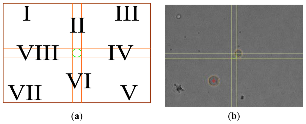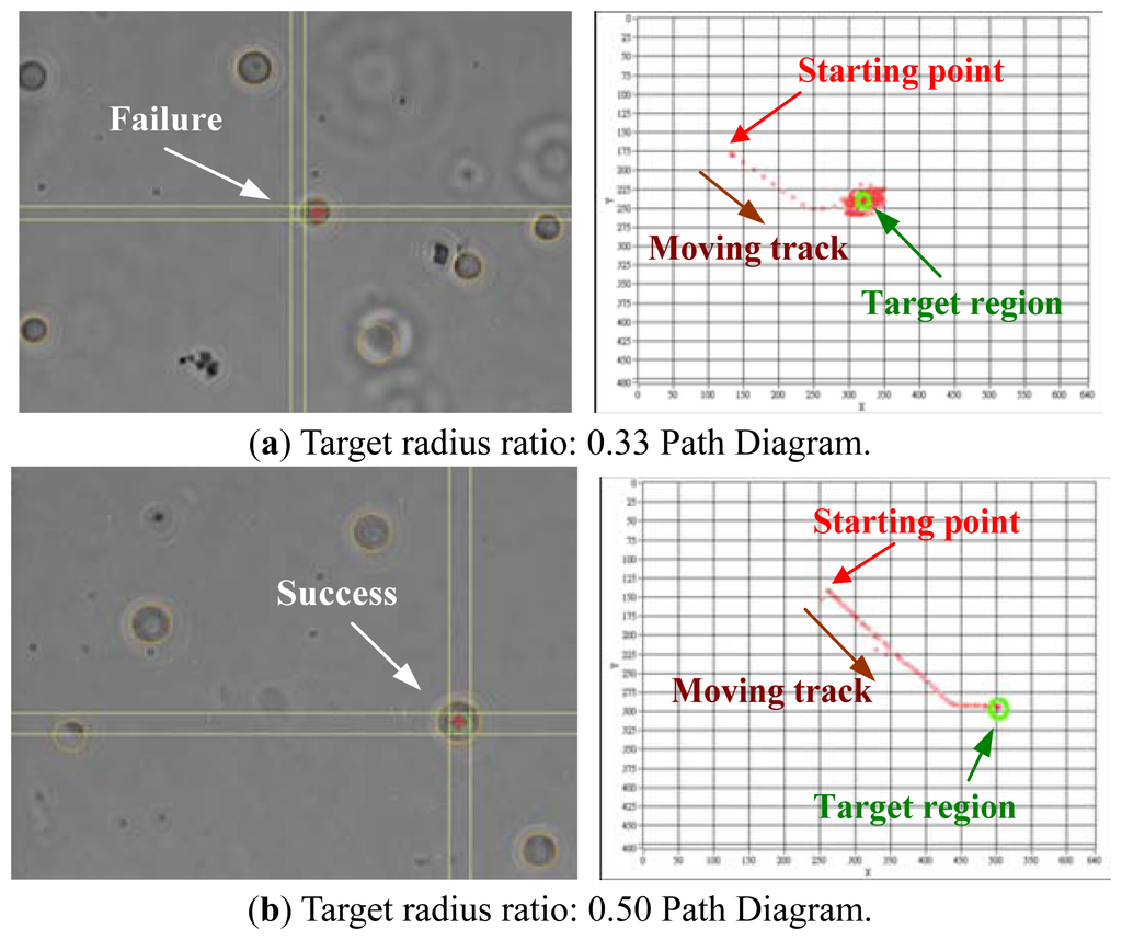 During the experiment, the control parameters were set first. A single cell was selected randomly and moved to any place on the image screen. Success was dependant on the target radius ratio. As seen in Figure 12(a), if the target circular range was too small, the tracked cell moved around the target circular range and could not stop within the circular target range to enable us to find a suitable target radius ratio parameter for successful positioning. If the microscope magnification is different, it is necessary to find an appropriate target radius ratio before beginning the experiment.