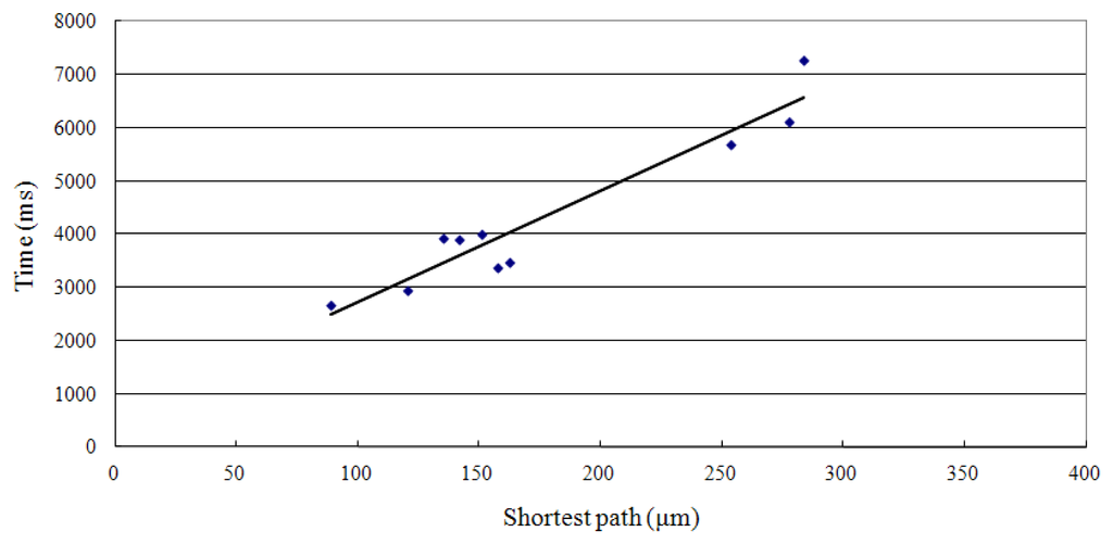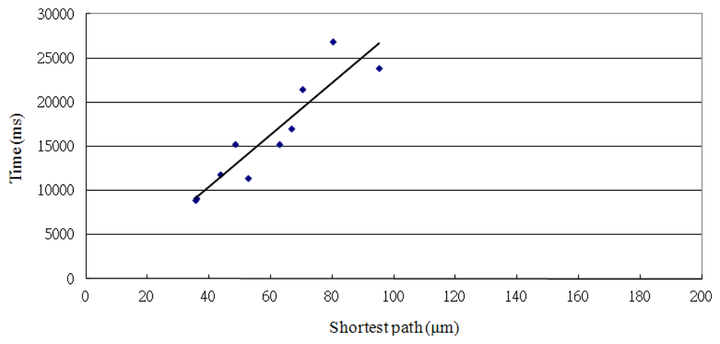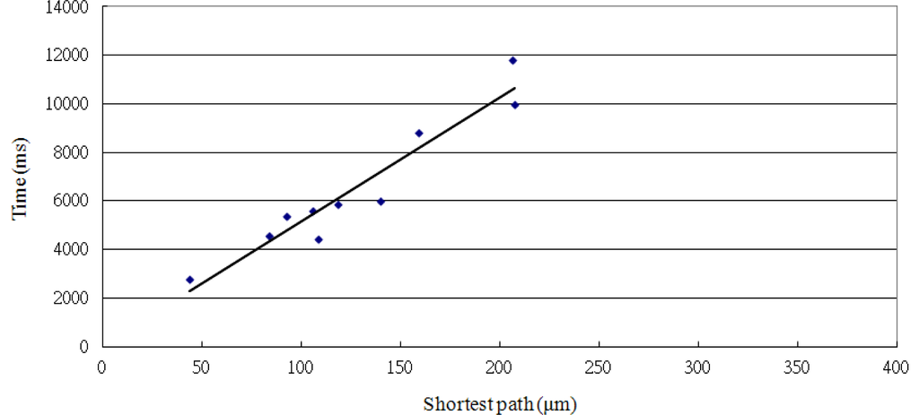 When the microscope magnification is 20X (10 μm = 20.22 pixels), and the target radius ratio is 1.0, the positioning success rate by voltage control can reach 100%. Table 4 shows 10 sets of data using voltage as a control factor. The shortest path is the straight line between the starting point coordinate and the target region coordinate. The real path is the cell moving track during positioning. The velocity value in Table 4 is defined as the shortest path divided by time, whereas the speed value is defined as the real path divided by time. Figure 13 demonstrates the relationship between the shortest path and the positioning time.