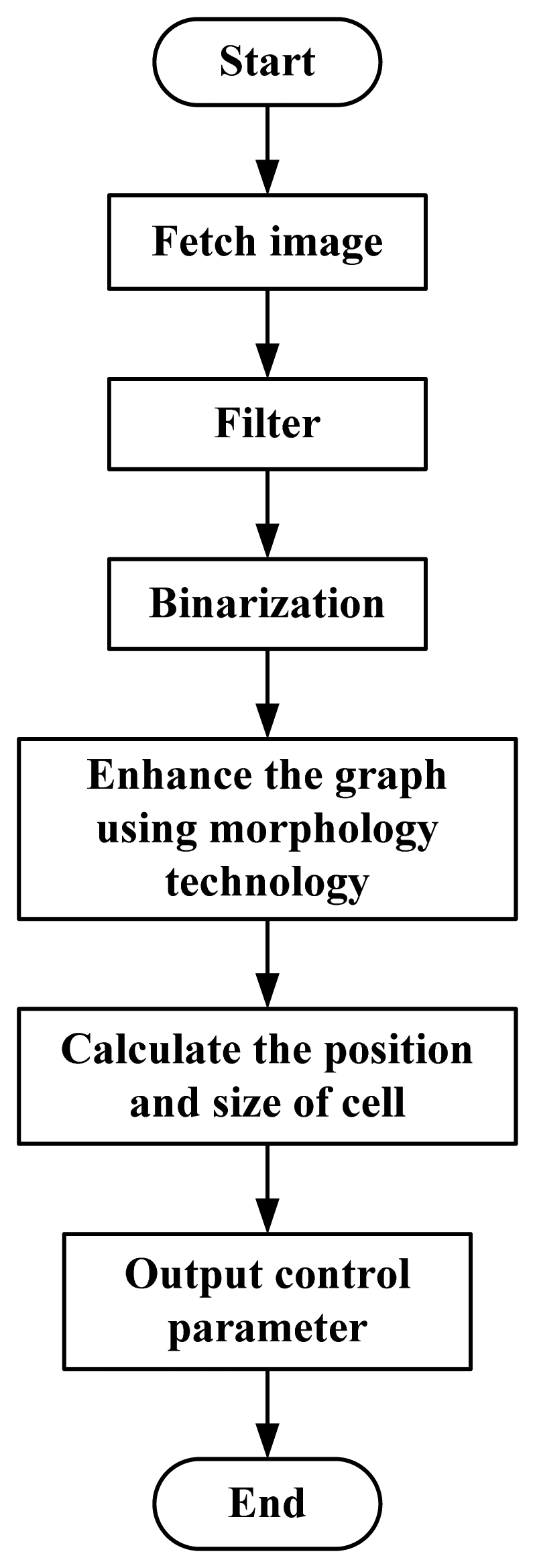 Because the acquired image will have noise, the image should be filtered to eliminate noise and obtain a smoother picture. In the beginning, an acquired image should be stored for observation, at this point the original image is no longer suitable for the image processing of cell tracking. In this experiment, binarization and morphological processing of the image were conducted to realize accurate cell manipulation [10]. Figure 2 represents the flow chart for the image processing software system.