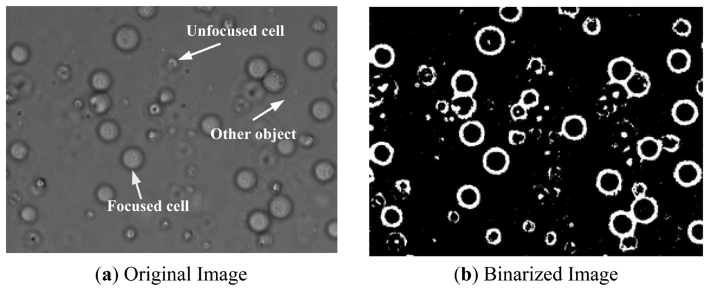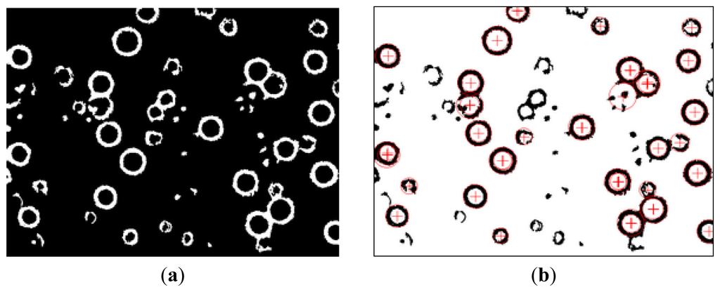From the binarized images, it can be seen that some doubtful, dead cells and other objects are retained in addition to the desired images. At this point IMAQ RemoveParticle subVI can be used to eliminate small impurities, clean up the images and prevent their influence on further detection (Figure 4(a)). Due to the fact U-937 cells have a circular configuration, they appear to have circular characteristics after preliminary image processing. Thus, by detecting the characteristic circular shape, the cell position coordinates and size can be determined. The IMAQ Detect Shapes subVI can find all approximate circles, and the location and size of every cell should be found quickly (Figure 4(b)).