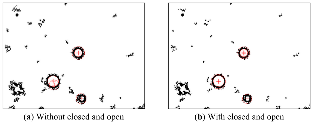The experiment also reveals that sometimes the retained ring thickness is uneven, or the outer ring is not uniform and has bumps. In such cases, the IMAQ Detect Shapes subVI may detect smaller, larger, or off-the-cell-center circles. Therefore, prior to detecting circles, image binarization processing for morphology is necessary. The binary image morphological algorithm is based on dilation or erosion operations. Gonzalez and Woods stated that dilation operations could enlarge or thicken the object, and erosion operations could shrink or thin it [6]. Using these two operations alternately could serve two functions: open and closed image functions. Open image subVI uses erosion first, followed by dilation, to separate bonded objects; close image subVI uses dilation first, followed by erosion, to bond separated objects. After practical experiments, the use of open and closed image subVIs from NI Vision software led to significant improvements in the bonding and separation of objects. Figure 5 indicates that the use of open and closed image subVIs can correct eccentric problems.