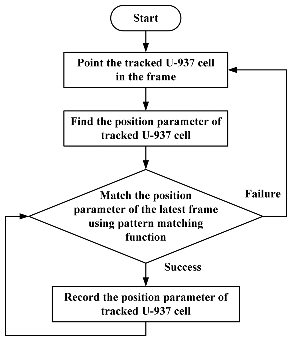 After image processing, normal cells appear as regular circles; abnormal cells could be smaller, shrunk or deformed. A flow chart showing the tracking of cells is shown in Figure 6. At first, the PC mouse is moved to the tracked U-937 cell and clicked one time in the image frame to choose the target cell to be tracked. The system then compares the location coordinates of the mouse with respect to the location of all the circles in order to determine the target cell to be tracked and to complete the tracking behavior. The cell image is stored in the computer memory via a self-learn pattern function for the basis of identification, and the Pattern Matching subVI is then used to identify the cell in the next picture.