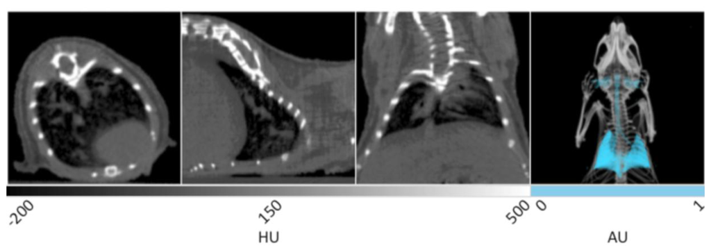 The fourth panel of Figure 1 shows a 3D rendering of the same data set. The lungs have been segmented using PMOD software in order to provide enhanced visualization. Segmentation allows the isolation of voxels in a predetermined range of Hounsfield Units. Using this tool within the PMOD software, all of the voxels corresponding to lung air volume within the range of −500 to −250 HU can be automatically selected and allocated into a new data set with identical geometry to the parent data to preserve 3D fusion. Once selected, the lung air volume can then be quantified and saved as a unique data set in which the intensity values have been set to 1 or 0 representing positive or negative segmentation. After false coloring of the lung volume data set, the original CT image can be overlaid to provide spatial reference. In the 3D rendering, the entirety of the lungs can be seen in addition to the bronchi, trachea, and ear canals. This rendering enables the visualization of anatomical changes occuring throughout the entire tissue during disease progression, especially those that result in decreased lung volume. Advanced algorithms are currently available to improve the resolution of lung segmentation with disease progression in both clinical [26] and pre-clinical [27] settings.