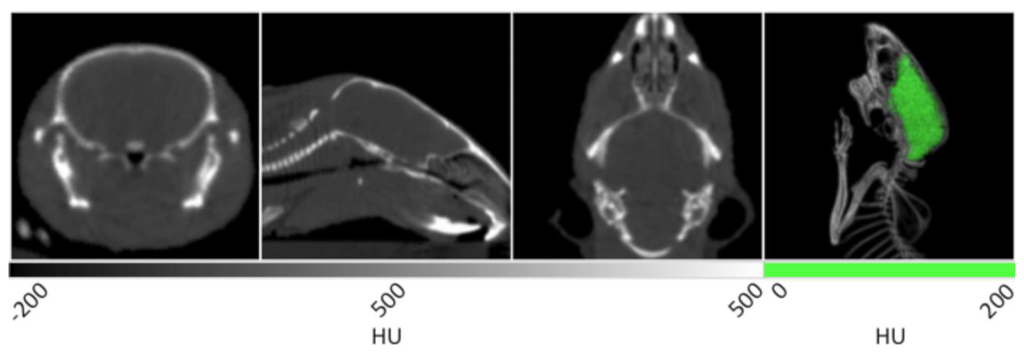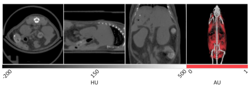 For slice view displays, the data was typically contrasted to between −200 and 500 HU and a jpeg file captured using PMOD software in which the transverse, coronal and sagittal slices were displayed. PMOD was subsequently used for all masking and segmentation to generate anatomy specific data sets. Segmentation for lung and fat tissue was applied using HU ranges characteristic of these tissues after masking some image features. For animals receiving contrast agents, volumes of interest (VOIs) were manually drawn around target structures, with subsequent masking of the external VOI space to create an independent data set.