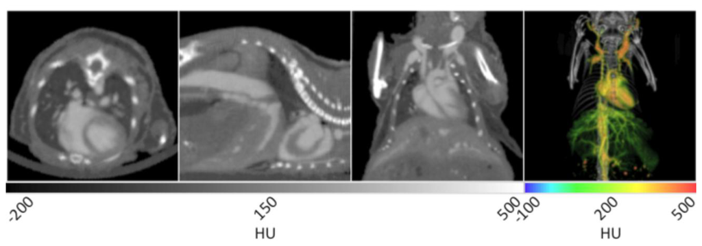Abnormalities of the cardiovascular system are implicated in several diseases. Abdominal aortic aneurysm (AAA) is one area of particular concern due to the high mortality rate associated with a rupture [41]. Many mouse models of AAA exist, the study of which has the potential to improve the understanding and treatment of the disease [42]. The murine aortic arch has proven to be a valid alternative for studying the human aorta [43]. Tumor angiogenesis in mouse models of cancer are also an active area of study [44]. As noted above, mouse models of cerebral ischemia are extremely important for pre-clinical research of stroke. The similarities between the cardiovascular systems of humans and mice make them valuable disease models for non-invasive imaging with microCT [45].