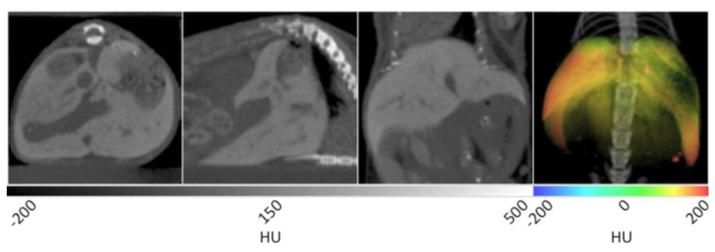 The slice data and a 3D reconstruction of an obese mouse (B6.V-Lep°B/J, male, 12 weeks old) are displayed in Figure 2. In the transverse view shown on the left, significant visceral fat deposits can be observed around the kidneys as lower density volumes owing to the decreased attenuation of adipose. In the sagittal view, more extensive subcutaneous fat deposits can be observed in addition to those in the abdomen. In the coronal view, fat deposits are seen around the kidneys, gastrointestinal tract and liver. The fat volume was segmented in a similar manner as the lungs using PMOD software, however values were bounded to −200 and −50 HU. Once the adipose tissue was segmented and allocated into an independent data set, it was false colored red and overlaid on the original CT to aid visualization. In the right frame of Figure 2, the 3D rendering displays the full extent of the spatial distribution of the fat deposits. Specifically, the extent of the visceral and subcutaneous adipose is highlighted, especially around the limbs and gut area. The segmented adipose tissue may be quantified in units of cm3, and divided by the whole animal volume to give a percent body fat value that may be monitored over time and under different experimental conditions.