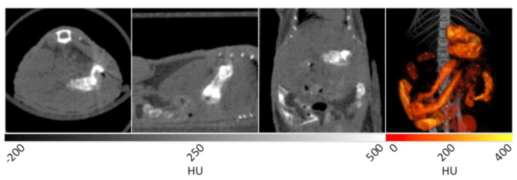 ExiTron™ nano 12000 (Miltenyi Biotec, Auburn, CA, USA) is a commercial contrast agent that enables CT imaging of the vasculature, liver, and spleen. ExiTron™ nano 12000 is an alkaline earth metal nanoparticle. Because alkaline earth metals exhibit high amounts of X-ray absorption, ExiTron™ provides excellent attenuation and contrast enhancement. After injection, ExiTron™ circulates in the blood stream which allows for vascular enhancement. Peak enhancement of the vasculature occurs at approximately 2 minutes post injection [71]. As the reagent circulates through the blood, it is taken up by Kupffer macrophages within the reticuloendothelial system in the liver, and peak contrast is observed 4 h post injection. Thus, the reagent is cleared through the liver and contrast enhanced regions represent areas of normal function. ExiTron™ nano 12000-enhanced CT imaging has also been used to update and improve the anatomical description of the murine liver and hepatic vasculature [72]. Contrast enhanced microCT has been used to image liver lesions, which will present as negative contrast due to a lack of functional uptake of contrast agent. For example, as the liver increases in density due to contrast enhancement by Fenestra™ VC [73], tumor metastases or other lesions are observed as darker contrast within the brighter tissue space [74]. The diameter (mm) and quantity of these cancer sites may be measured through straightforward image analysis. Unfortunately, while Fenestra™ VC was commercially available and widely used for microCT imaging of the liver, it was recently discontinued by the vendor (ART Advanced Research Technologies Inc., Montreal, QC, Canada). Another study involving liver metastases of colon carcinoma, found that contrast enhanced microCT imaging provided greater resolution than MRI with a fraction of the image acquisition time. MRI, however, did not require P.O. contrast enhancement, and the increased signal to noise ratio enabled the earlier detection of smaller lesions [9].