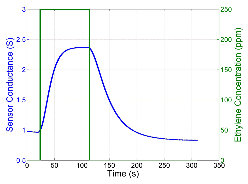 One of the main drawbacks of MOX sensors for open sampling applications is the slow response time and the even slower recovery time. Figure 1 shows the response time and recovery time in a closed sampling system without disturbances like turbulence and advection of the airflow. The MOX sensor was exposed to a pulse of ethylene and the sudden variation in the exposure of the sensor generates exponentials in the response. Those exponentials have different time constants depending on whether the conductance of the sensor increases (faster) or decreases (slower). This observation forms the foundation of the proposed change point detection algorithm, even if in an OSS additional disturbances affect the signal.
