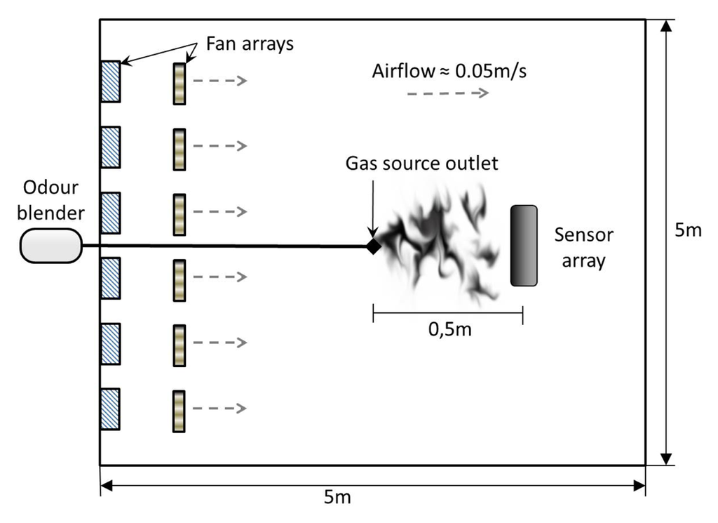 Experiments were carried out with static sensors in a 5 × 5 × 2 m3 closed room in which an artificial airflow of approximately 0.05 m/s was induced, see Figure 2. The airflow is created using two arrays of four fans, one placed on the floor and one on the wall. The gas source is an odour blender, a device developed by Nakamoto et al. [], which allows fast switches in between different mixtures of compounds with a variable concentration. The outlet of the olfactory blender is placed on the floor 0.5 m upwind with respect to an array of 11 commercial metal oxide gas sensors from Figaro Engineering [] (TGS2600 × 2, TGS2602, TGS2611, TGS2620) and e2v Technologies [] (MiCS 5521 × 2, MiCS2610, MiCS2710, MiCS5121, MiCS5135). The selected sensors have overlapping sensitivity and they respond to a wide range of target compounds. The airflow at the outlet of the odour blender is set to 1 L/min. The sampling rate of the sensors is 4 Hz.