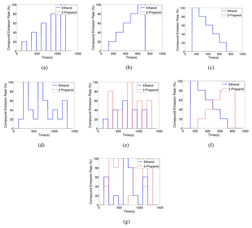 In order to create a database that allows studying the dynamic behaviour of the sensors when consecutively exposed to different analytes, seven different odour emitting profiles have been applied. For all these profiles the gas source emits clean air for two minutes and the signal of sensors during this period is assumed as a baseline. Also, at the end of all the experiments the source emits clean air for 2 min. Figure 3 shows the intensity profile for the gas source in the various emission strategies. A total of 54 experimental runs have been performed.