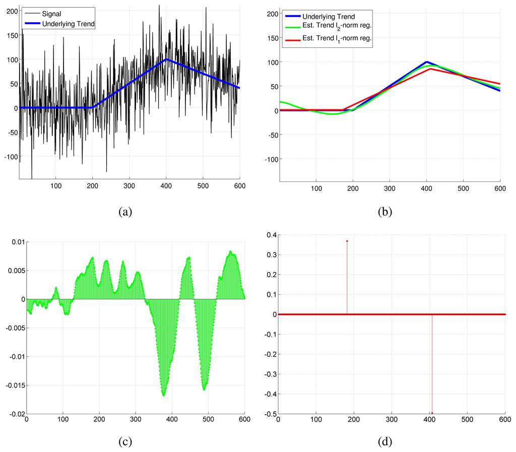 λ ≥ 0 is a regularization parameter used to control the trade-off between the deviation of the estimated trend from the signal and the smoothness of the trend encoded by ║DDx║1. For the case of piecewise linear filtering, smoothness is encoded as minimization of the second derivative, which for a line (assumed in linear trend filtering) is exactly equal to zero. The use of the l1-norm in the regularization term is the main difference between the trend filtering method proposed in [] and the well known Hodrick-Prescott filtering [] that uses instead an l2-norm regularizer. The l1-norm is used to induce sparsity in the smoothness term, i.e., a solution for which the smoothness term is exactly zero for most of the points and greater than zero in few points. This results in a trend that is “mostly linear” with few sharp kink points, opposed to the trend found with a l2-norm regularizer that intuitively never “bends too much” but is also not a perfect line (the l2-norm does not induce sparsity). Figure 4 presents a toy problem that gives a practical example of this concept. Notice how the trend obtained with the l1-norm preserves the piecewise linear shape, with clear kink points between the lines, while the l2-norm trend is a smoothed-out version of the original trend where the break points between the line pieces are not clear. This is reflected in the residuals ║DDx║ that are equal to zero except at the kink points for the l1-norm regularization, while for the l2-norm regularization they are always very small but rarely exactly equal to zero. This makes l1-norm regularization more suited to detect change points, as the change points can be detected by the non-zero elements in the kinks vector.