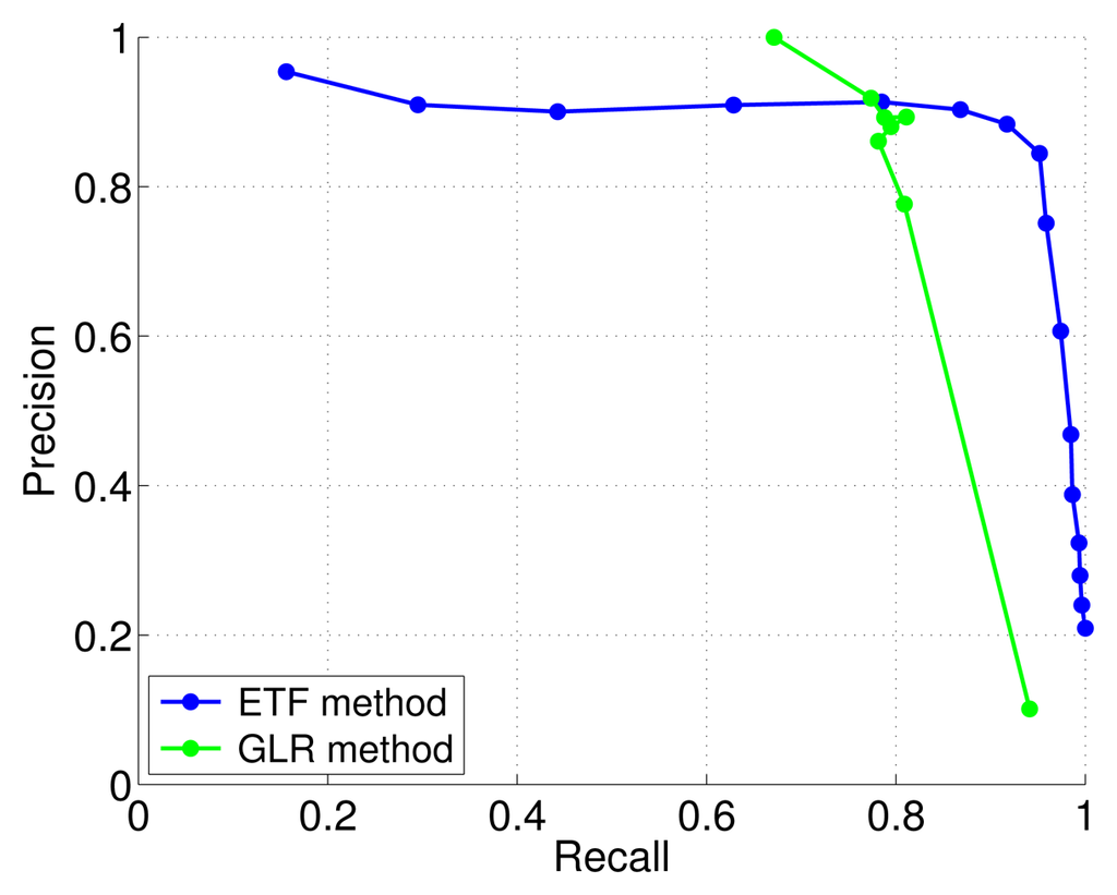 In Figure 7 an example of precision-recall curve comparing TREFEX and GLR for the MiCS 2610 sensor averaged over 54 experiments is shown. Qualitatively similar graphs were obtained for the other sensors. The maximum F-measure is attained at the point of the precision-recall curve that is closest to the upper right corner. It is clear from the figure that the maximum F-measure attained by the TREFEX algorithm is higher than the one obtained by GLR. Table 2 shows how TREFEX outperforms GLR for each of the considered sensors.