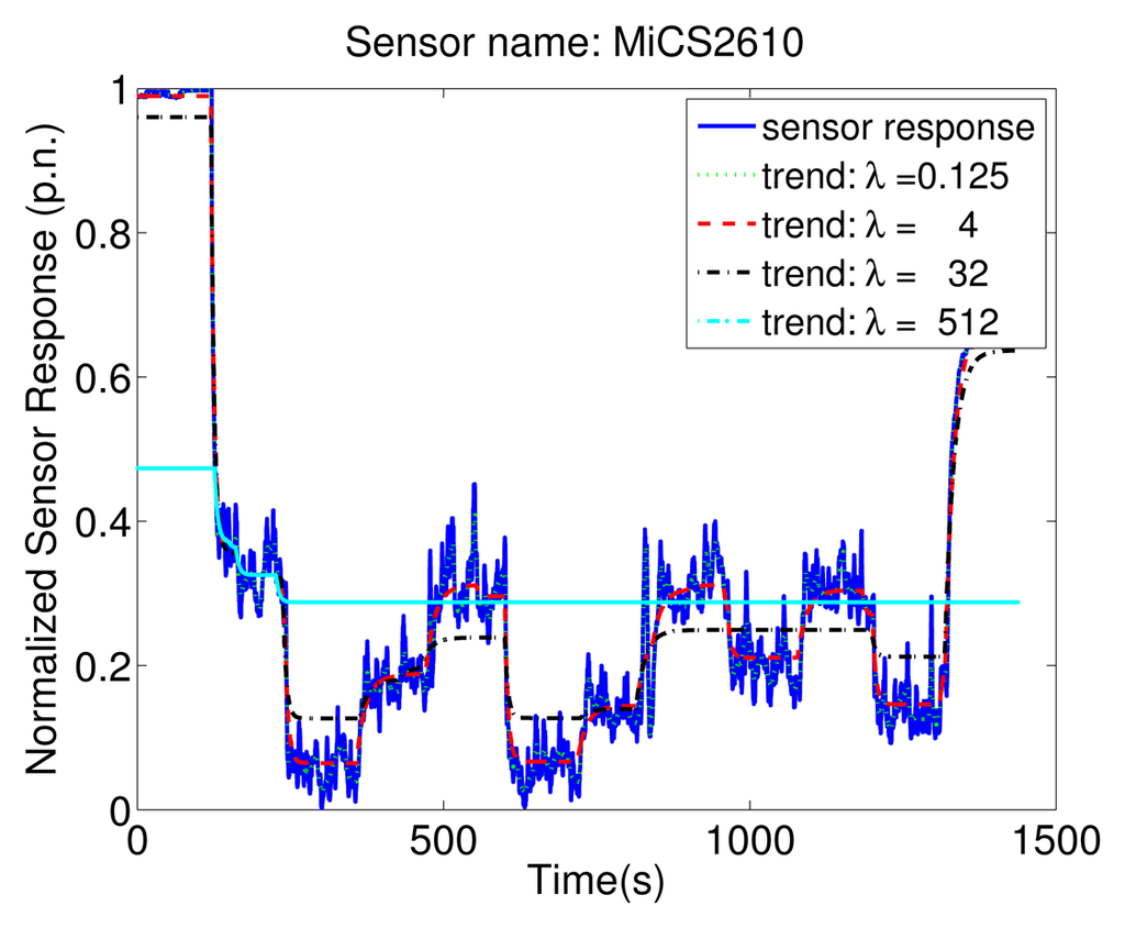 The key idea behind the proposed change detection approach is that a change in the emission modality of a gas source appears as an exponential trend in the response of MOX sensors. MOX sensors, due to their long response and recovery times, can be modelled as a first order system whose step response is indeed an exponential []. The proposed method interprets the sensor response by fitting piecewise exponential functions with different time constants for the response and recovery phase. The number of exponentials is determined automatically using an approximate method based on l1-norm regularization. This asymmetric exponential trend filtering problem is formulated as a convex optimization problem, which is particularly advantageous from the computational point of view. Section 4.1 presents an introductory discussion on piecewise linear trend filtering based on [], Section 4.2 presents the change point detection algorithm for a single sensor, Section 4.3 presents a strategy for selecting the parameter of the algorithm, and Section 4.4 extends the algorithm to the case where a sensor array is available.