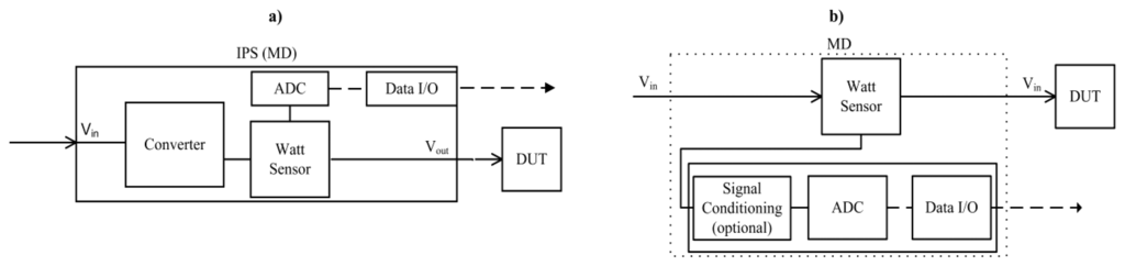 In this type of MD an additional hardware capable to provide EC of one or more DUTs must be used. This is the case of an intelligent programmable power supply (IPS). An IPS is a power supply (see Figure 2(a)) with additional measurement and communication blocks. The I/O interfaces, such as USB/Ethernet are available in order to configure/read IPS parameters and collect EC values. The IPS collects periodically the current, voltage or wattage consumed by the DUT.