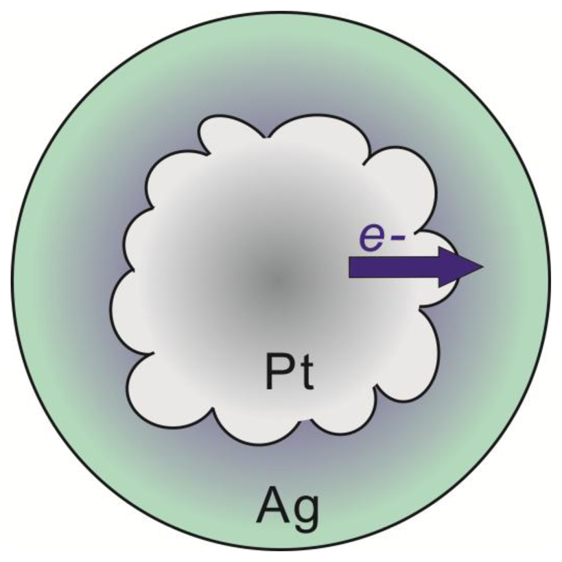 Platinum coated by silver nanoparticles was synthesized, which displays a unique structure where polycrystalline platinum particles are completely encapsulated in continuous monocrystalline silver shells. These particles display accentuated electronic properties, where the silver shells gain electron density from the platinum cores, imparting enhanced properties such as oxidation resistance. This electron transfer phenomenon is highly interfacial in nature, and the degree of electron transfer decreases as the thickness of silver shell increases. The nanoparticle structure and electronic properties are studied and the implication to creating sensing probes with enhanced robustness, sensitivity and controllable plasmonic properties is discussed.1. Introduction
