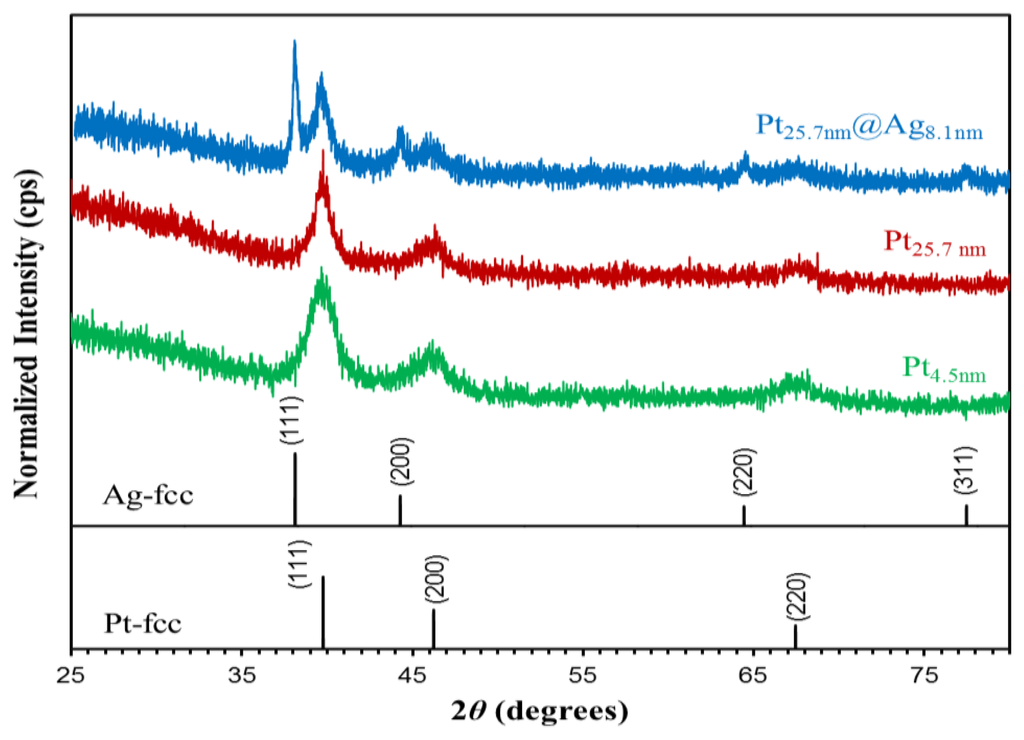 The larger sized platinum NPs as well as the Pt@Ag structures possess a unique crystal structure as evidenced by XRD analysis. Figure 5 shows the XRD patterns of three NP samples including platinum NPs with a size of both 4.5 and 25.7 nm, as well as for Pt25.7@Ag8.1 NPs.