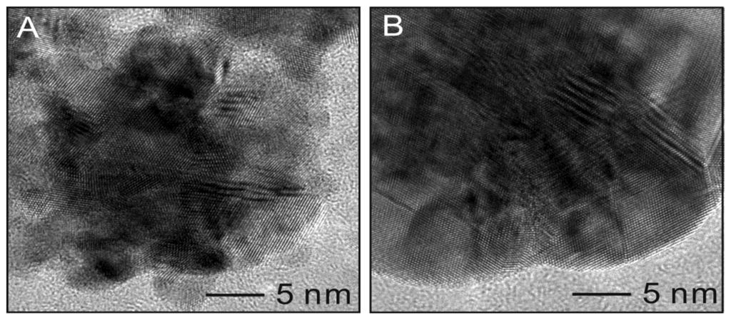 HRTEM analysis provides additional confirmation of the crystalline structure of the Pt@Ag NPs. Figure 6 shows HRTEM images of a single platinum NP (25.7 nm) as well as for a single Pt25.7@Ag8.1 NP. The bare platinum NP shows a clustered morphology with atomic lattice planes facing several different directions, suggesting a polycrystalline nature. Measurement of the atomic plane spacing gives an average value of 0.220 nm, consistent with the 111 plane of fcc platinum [15]. For the silver coated sample, the outermost area appears more continuous in terms of the crystal lattice. The measurement of the atomic plane spacing at the periphery of the particle gives a value of 0.249 nm, consistent with the 111 plane of fcc silver [16].