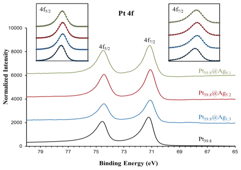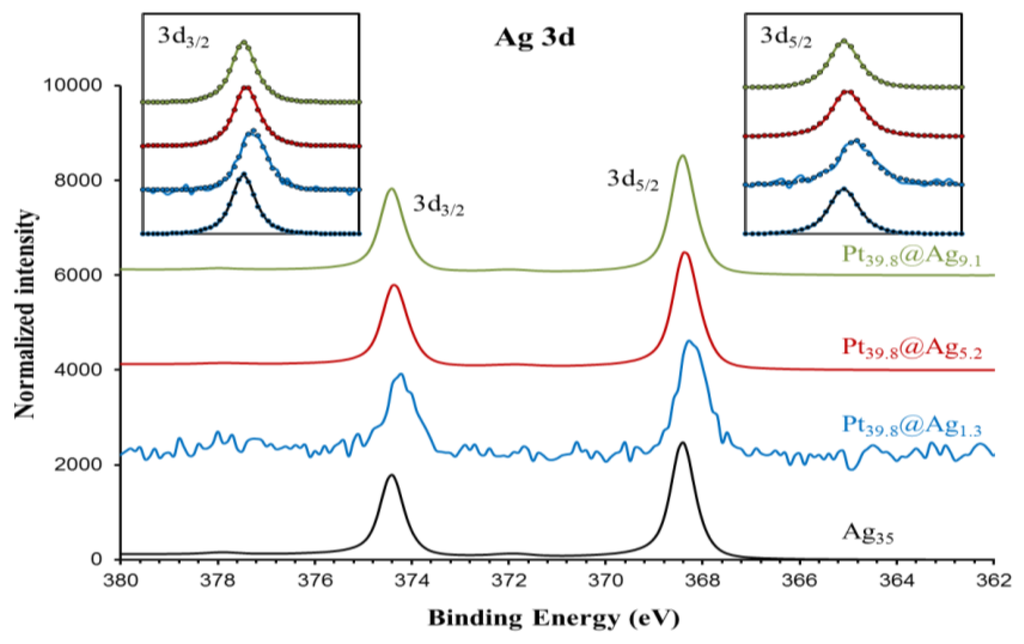In order to gain a diagnostic assessment of the electronic properties of the silver shell in Pt@Ag NPs, XPS analysis was performed on a series of Pt@Ag NPs with increasing shell thickness. A total of five samples were analyzed including pure silver (35.0 nm) NPs, Pt39.8@Ag1.3, Pt39.8@Ag5.2, Pt39.8@Ag9.1 and pure platinum NPs (39.8 nm). Figure 7 shows the collected XPS spectra in the Ag 3d area while Figure 8 shows the XPS spectra collected in the Pt 4f region.