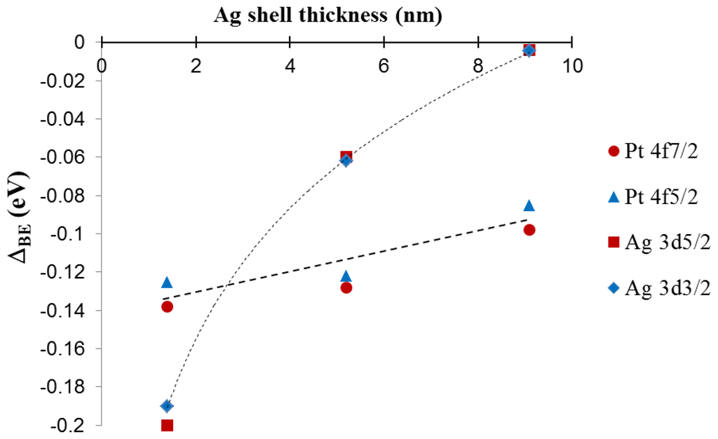 The lines connecting the data points in the graph are included to assist in visual assessment of the relative data point positions. The observations are broadly consistent with an electron transfer phenomenon where the silver shell gains electron density from the core metal, in this case platinum [9,11,19]. The phenomenon is more pronounced for thinner silver shells because of the interfacial nature of the electron transfer and ultimately results in enhancement of the chemical properties of the silver shell. For instance, an electron rich silver shell is expected to become resistant to oxidation [9,10,19]. A simplified way to understand the observed shift in the XPS peaks is through the effect of relative electron density on the resulting binding energy of peaks in the XPS spectra. As silver gains electron density, it becomes relatively easier to remove electrons from silver sites, hence the binding energy is negatively shifted. For platinum, the 4f peak is also negatively shifted, which is counter intuitive, however this arises from the fact that the electronic transfer process is complex in nature. In reality, the true electronic configuration of the Pt@Ag NP structure may consist of electron donation and back-donation in various orbitals of the metals, which may account for the observation of a concurrent negative shift in silver 3d and platinum 4f orbitals. In addition, because platinum core NPs actually consist of small platinum nanocrystals and have highly roughened surfaces while Pt@Ag NPs have more smooth surfaces with relatively large silver grain sizes, there should be some differences in initial and final state effects of the electron emission process. This may be one of the reasons why the negative shift in platinum 4f peaks is observed. The electronic transfer phenomenon is supported by the observation of a sharp decrease in the BE shift for silver as the silver shell thickness increases, while for platinum the shift in binding energy only changes by a small degree. This shows that the electronic enrichment of silver in the 3d orbital is interfacial in nature, which can only arise in the electronic transfer process. A study on the electronic configuration of bare platinum versus coated NPs using X-ray Absorption Near Edge Structure (XANES) analysis could provide additional information on the electronic configuration of these materials [11].
