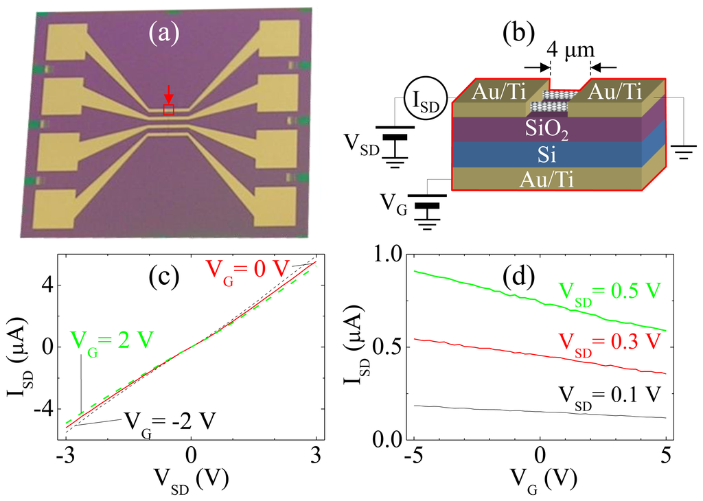 Figure 1(b) shows the schematic of the experimental setup, and the area in red line in Figure 1(b) is the magnification of the red area indicated by an arrow in Figure 1(a). After fabrication of the CNT sensor, the variation of electrical current between source and drain electrodes (ISD) of the CNT sensor are measured while sweeping the source-drain voltage (VSD) or the gate voltage (VG) for electrical characteristics measurements as shown in Figure 1(c,d).