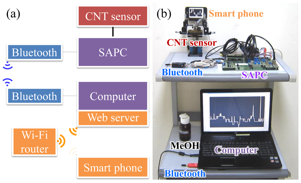 The wireless monitoring test platform is shown in Figure 3. It consists of a sensing part, a signal processing part, a local area network part, and a wide area network part. The sensing part consists of the CNT sensors and a connector between the sensors and the SAPC. One of the signal processing parts, the SAPC, transmits the digitally processed signal from the CNT sensors to the computer via wireless local area network using Bluetooth, after amplifying and processing the electrical signal while providing supply voltage (VSD) to the CNT sensors. The computer converts the digitally processed signal of the SAPC to electrical current by LabVIEW program (National Instruments Co., Austin, TX, USA) to send it through a monitoring device. The web server is programmed with LabVIEW to monitor the electrical current of the CNT sensors by a built-in web browser of a smart phone using the wide area network for Wi-Fi communication through a Wi-Fi router.